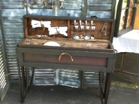 - SOLD “Antique Gem” Vintage Tool Box Cooler with Buffet Box (13×13). Folding legs out of old vises (16″x30″x 24″h)