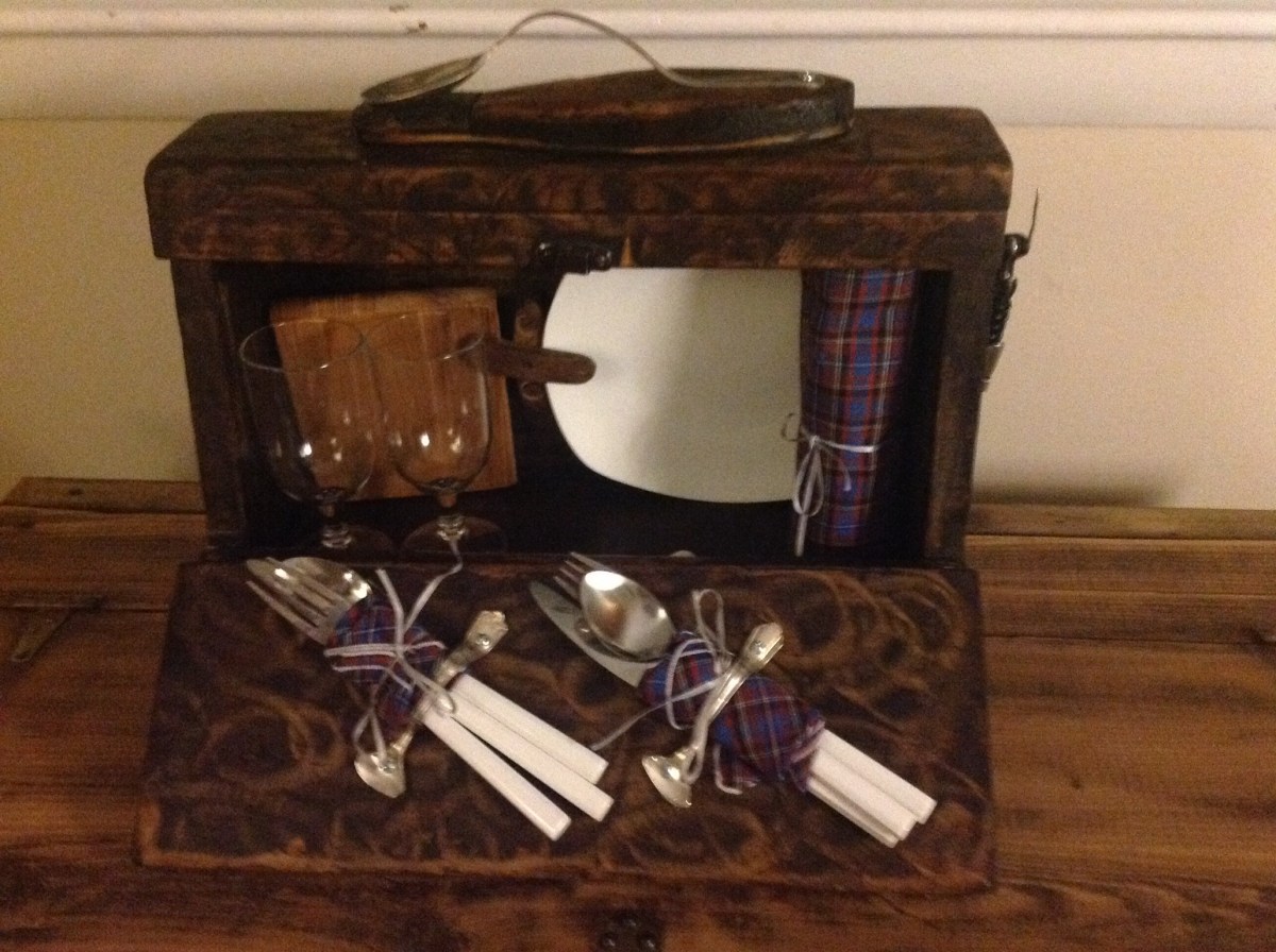 $120-Vintage Shoe Shine Picnic Box (16″ x 8″ x 15″) Open View: Top Handle hooks and straps made from vintage sterling silverware. Picnic for two complete with dishes, silverware, wine glasses, table cloth with matching napkins, cheeseboard and knife as well as a bottle opener.
